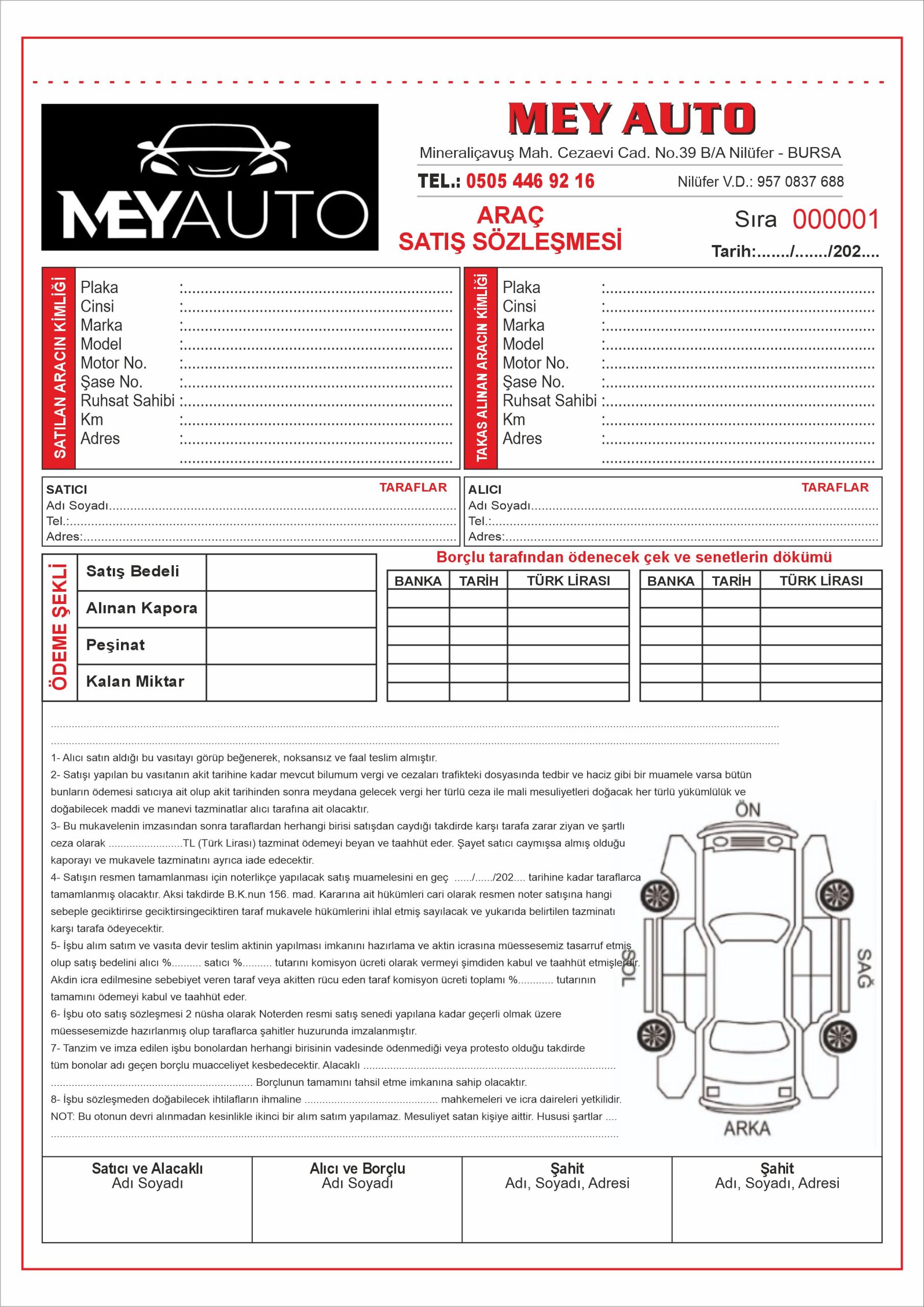 Araç Satış Sözleşmesi – İki Renk Baskılı A4 Ebat – 2 Nüshalı – Seri Numaralı