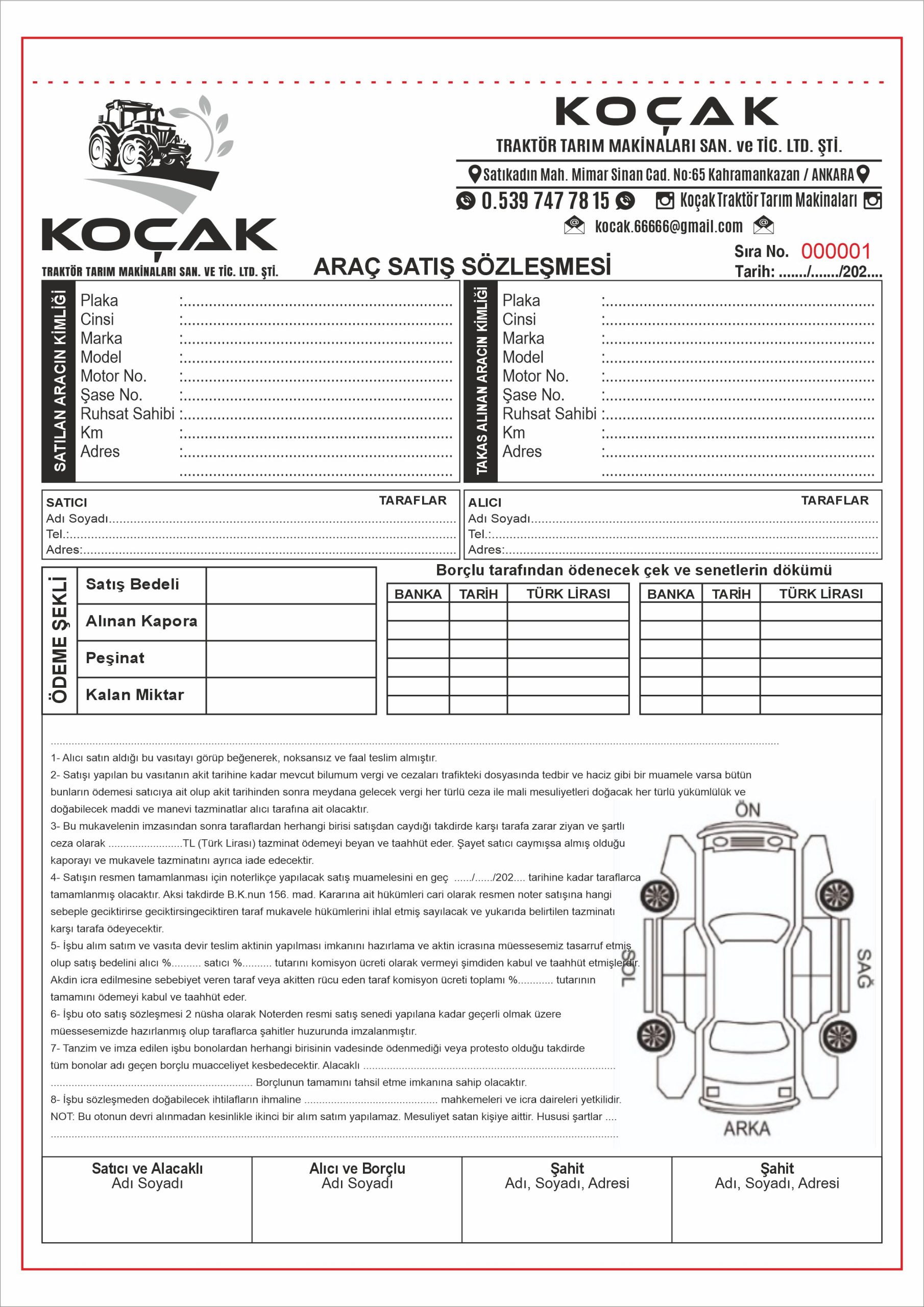 Araç Satış Sözleşmesi - Tek Renk Baskılı A4 Ebat - 2 Nüshalı