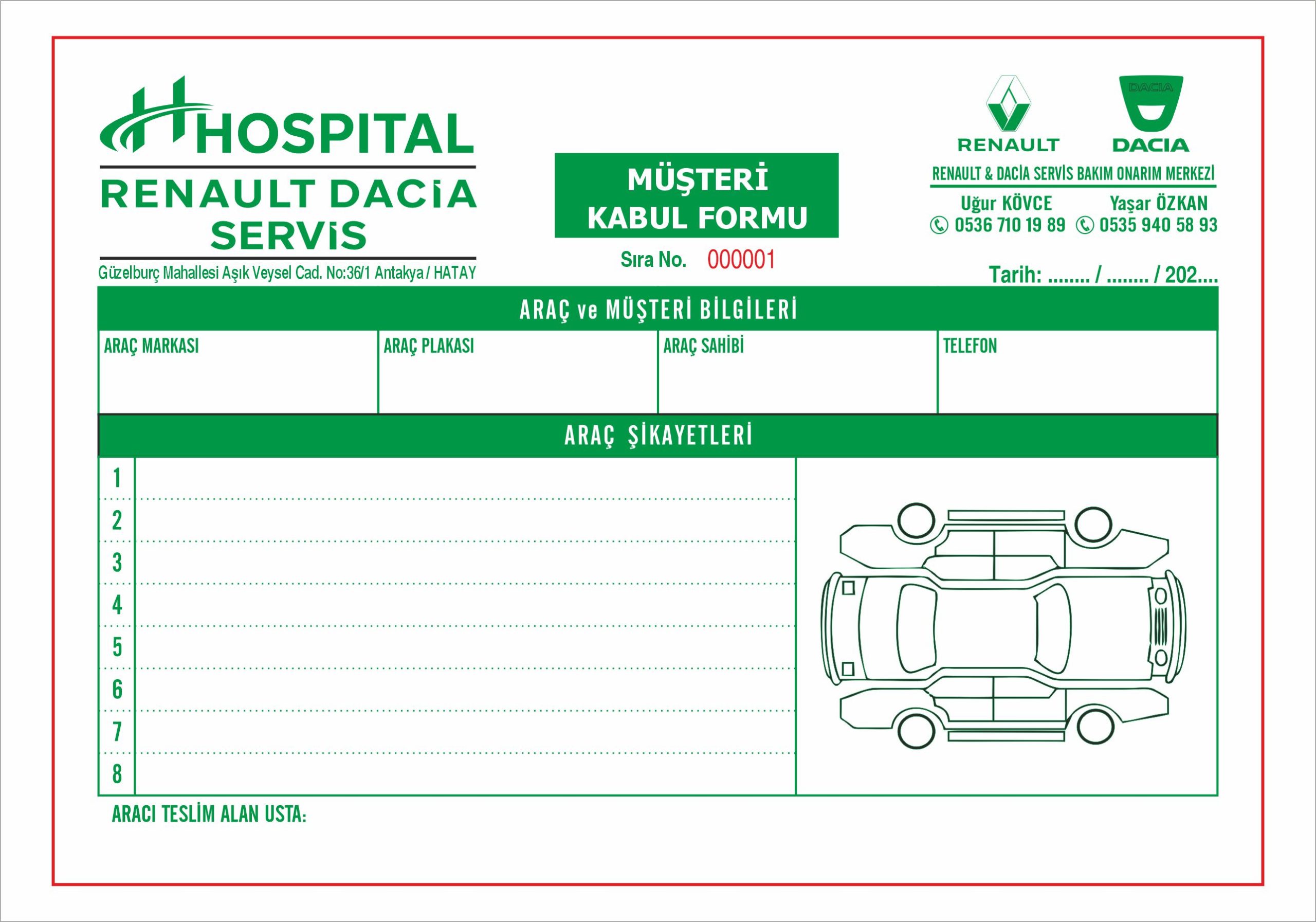 Araç Servis Müşteri Kabul Formu – A5 Ebat – Tek Renk Yeşil Baskılı – 2 Nüshalı