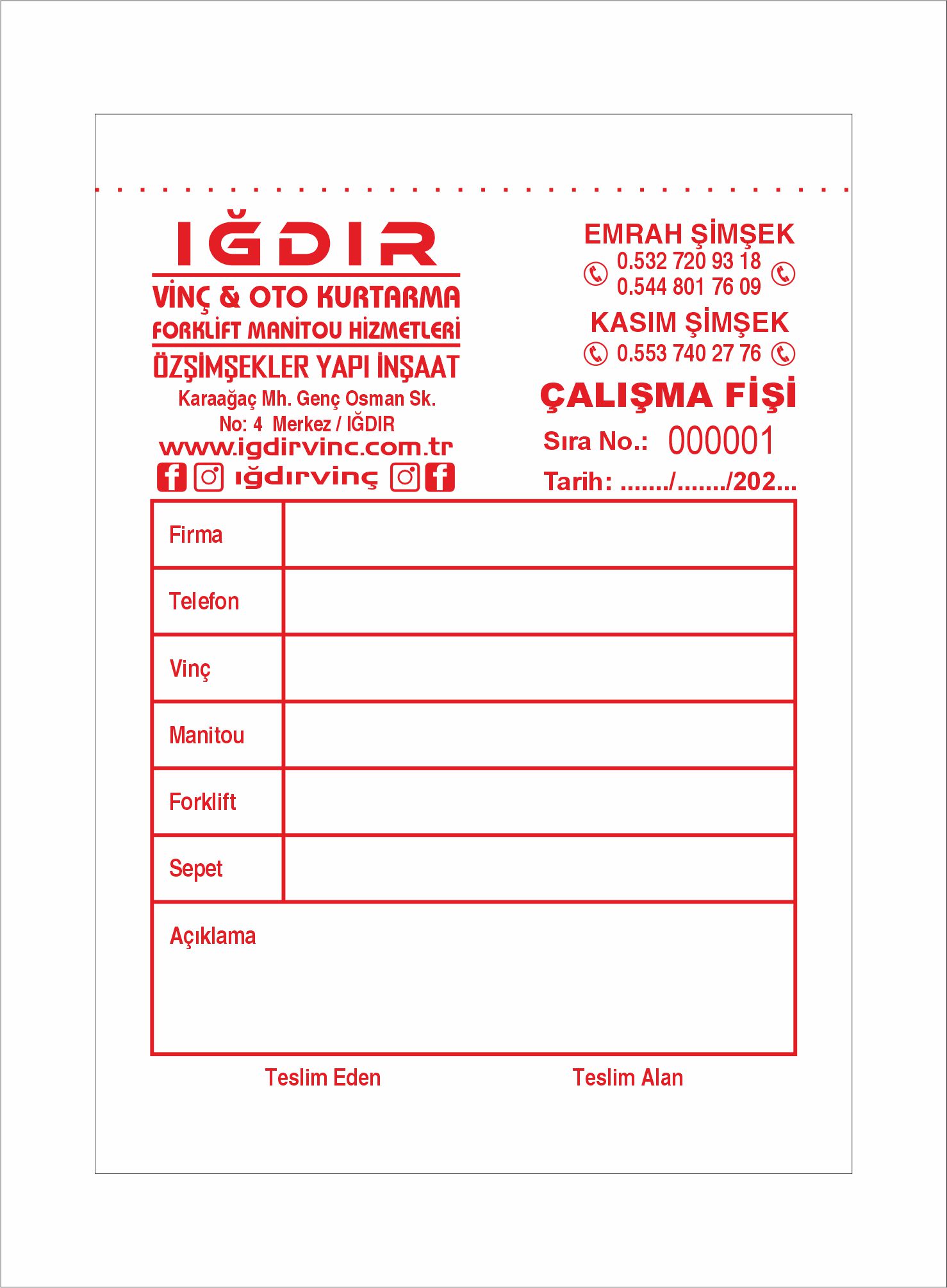 İş Makinası Çalışma Fişi – A6 Ebat – 2 Nüshalı – Tek Renk Baskılı